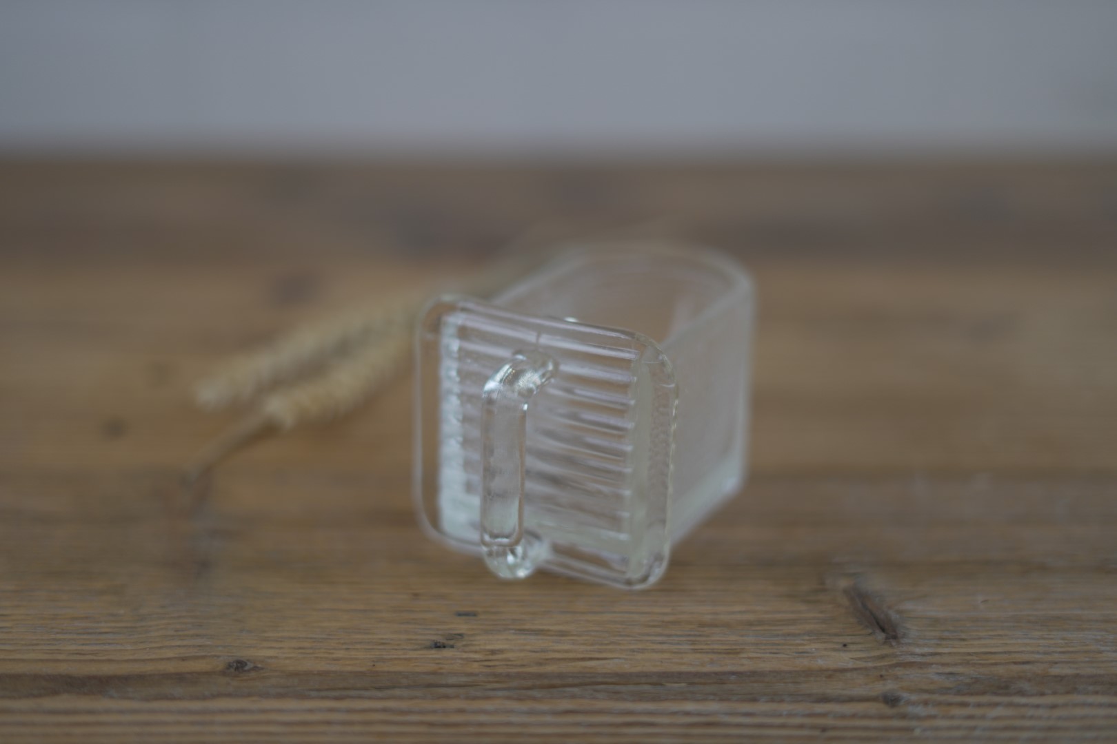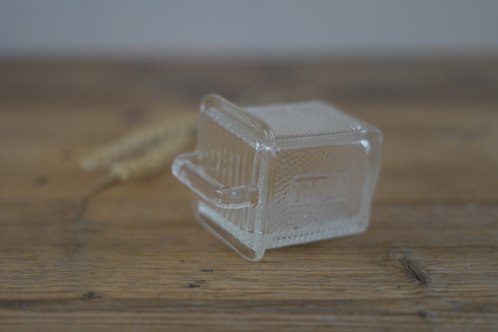 Die kleine alte Schütte aus Glas diente der Aufbewahrung von Gewürzen in einem Buffetschrank. Mit Griff und einem stabilen Schüttenrahmen ausgestattet, wurde die Glasschütte aus dem Schrank herausgezogen und der Inhalt bequem ausgeschüttet.