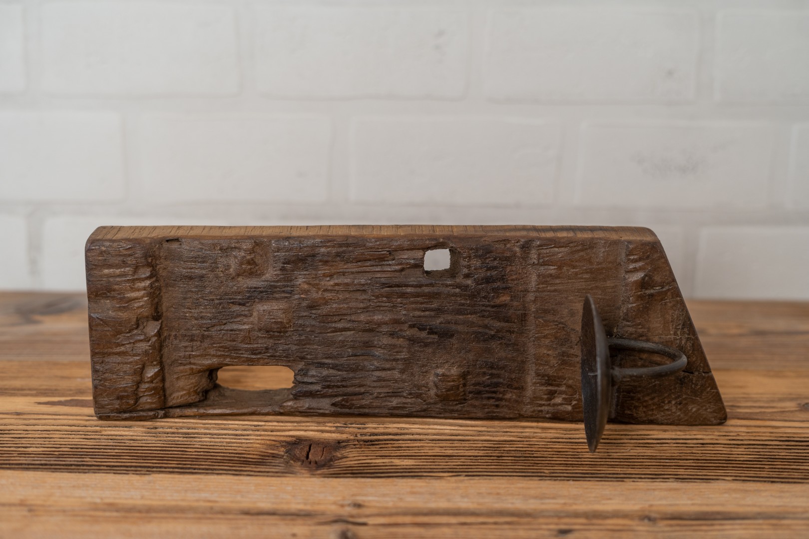 Dieser Vintage Kerzenwandhalter erzählt eine Geschichte – er besteht aus wiederverwendetem Altholz, das um einen robusten Kerzenhalter aus Eisen ergänzt wurde.